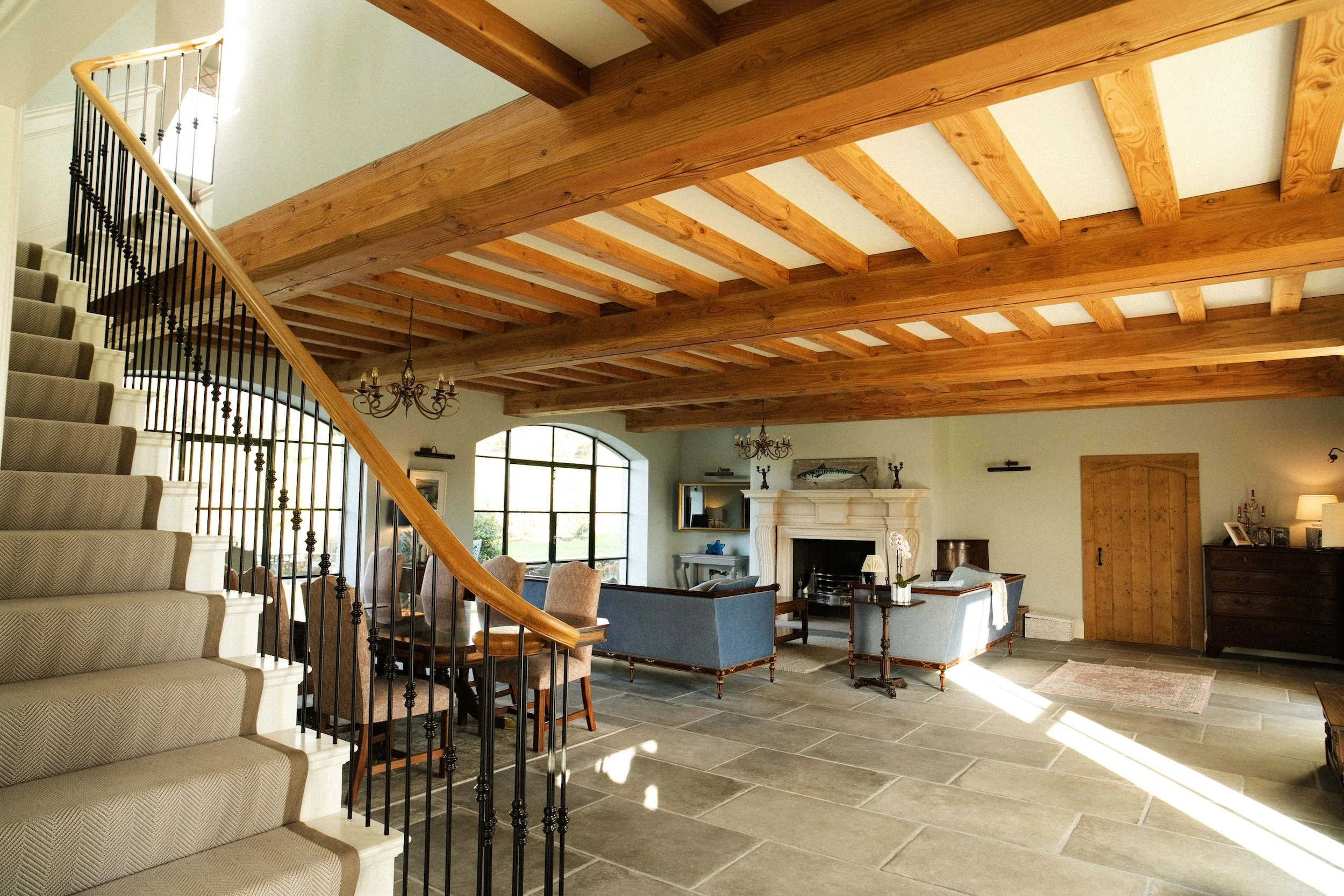 “Moss created for us a cut stringer staircase with black metal decorative spindles & with a polished oak handrail. He took inspiration from Victorian staircases and created a work of art which enhances the finish of our farmhouse. As a result of the quality of his workmanship and his passion for the craft we commissioned him to create a traditional oak door with decorative hand carved surround. It is so beautiful and a joy to walk through every day. Moss has a real gift for understanding what you envisage and then guiding you to the perfect end result.”